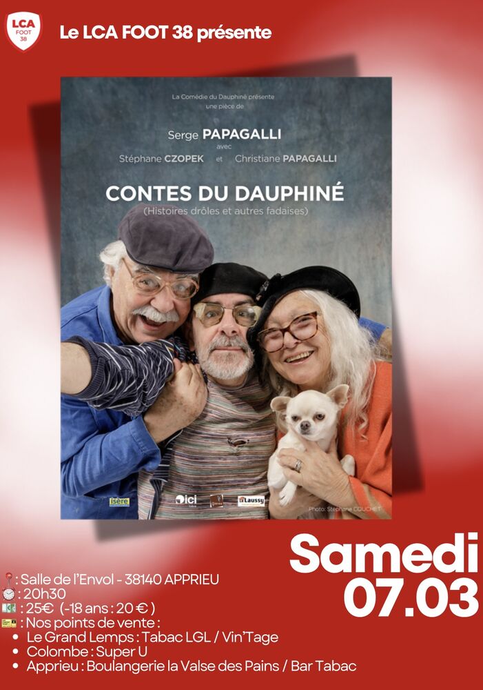 Le LCA Foot est fier de relayer un événement culturel exceptionnel qui aura lieu samedi 7 mars 2026 à Apprieu : la célèbre troupe de La Comédie du Dauphiné présentera son spectacle Contes du Dauphiné – Histoires drôles et autres fadaises, interprété par Serge Papagalli, Stéphane Czopek et Christiane Papagalli.