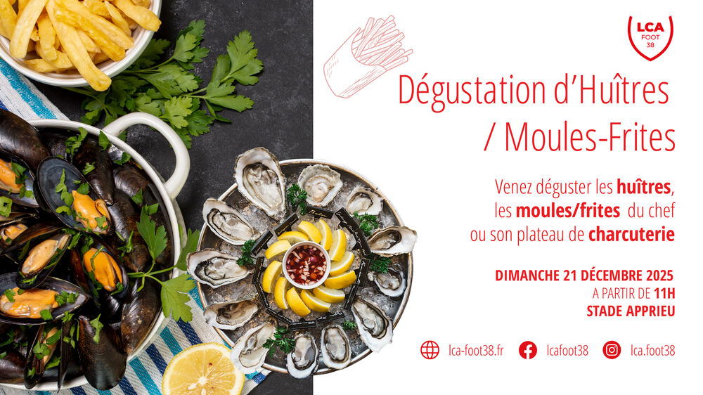 Le LCA FOOT 38 organise le dimanche 21 décembre 2025 à partir de 11 heures - au stade d'Apprieu - sa dégustation d'huîtres, moules/frites ou assiette de charcuterie.